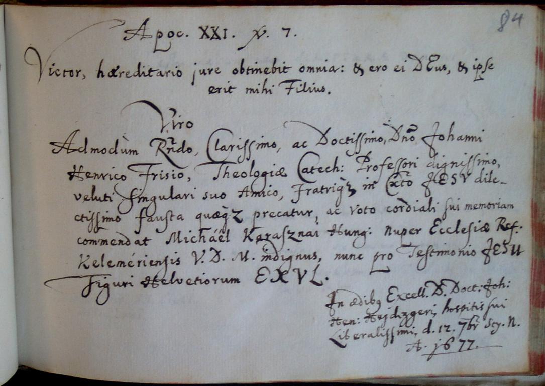 Kiegészítő szöveg: | Viro Admodum R/evere/ndo, Clarissimo ac Doctissimo, D/omi/no ... dignissimo, veluti singuari suo Amico Fratrique in Chr/is/to JESV dilectissimo fausta quaeque precatur, ac voto cordiali sui memoriam commendat |