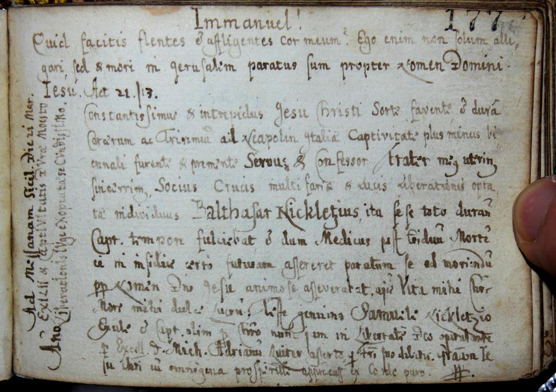 | Kiegészítő szöveg: | Constantissimus et intrepidus Jesu Christi Sorte favente et dura Carcerum ac Triremiu/m/ ad Neapolin Italiae Captivitate plus minus biennali furente et premente Servus et Confessor, Frater meus uterinus sincerrimus, Socius Crucis multifariae et Lucis Liberationis optatae individuus Balthasar Nickletius ita se se toto duran/te/ Capt/ivitatis/ tempore fulciebat, et dum Medicus post triduu/m/ Morte/m/ [...] in [...] certo futuram assereret paratum se ad moriendu/m/ p/ro/p/ter/ Nomen D/omi/ni Jesu animose asseverarat, [...] Vita mihi Chr/istu/s, Mors mihi dulce Lucru/m/ ..., qui Fr/atr/i suo dilectis/simo/ Gra/ti/am Jesu Chr/ist/i cu/m/ omnigena prosperit/a/te apprecat/ur/ ex Corde puro. |