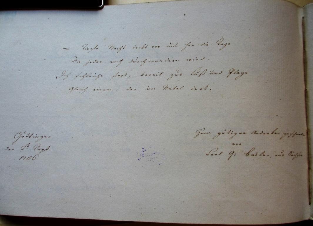 | Az inscriptio szövege: | Tiefe Nacht deckt vor uns her die Tage, Die jeder noch durchwandern wird, Ich schleiche fort, bereit zur Lust und Plage, Gleich einem, der im Nebel irrt. |