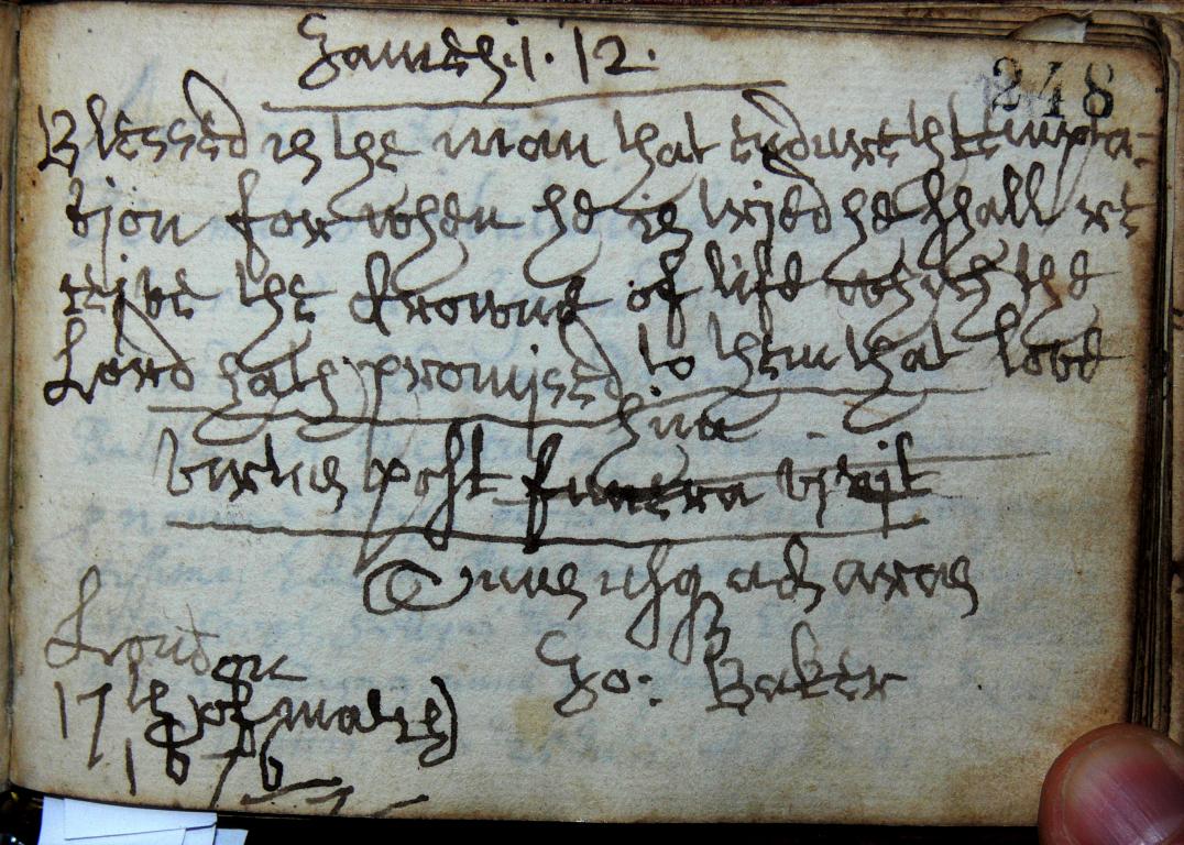 | Az inscriptio szövege: | (1/2) Blessed is the man that endureth temptatjon: for when he is trjed, he shall recejve the chrowne of life, which the Lord hath promjsed to them that love him. (2/2) Virtus post funera vjvjt, amicus [?] usque ad aras. |