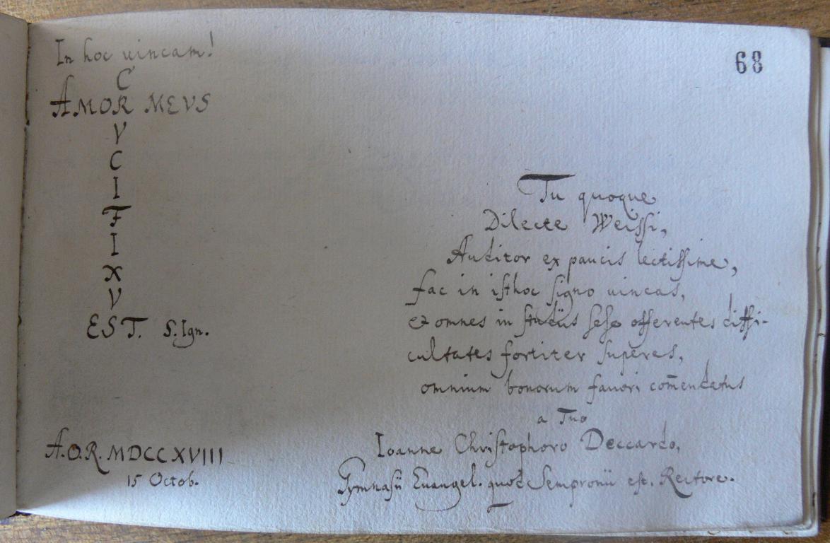 | Kiegészítő szöveg: | Tu quoque, Dilecte ..., Auditor ex paucis lectissime, fac in isthoc signo uincas, et omnes in studiis sese offerentes difficultates fortiter superas, omnium bonorum fauori com/m/endatus a Tuo |