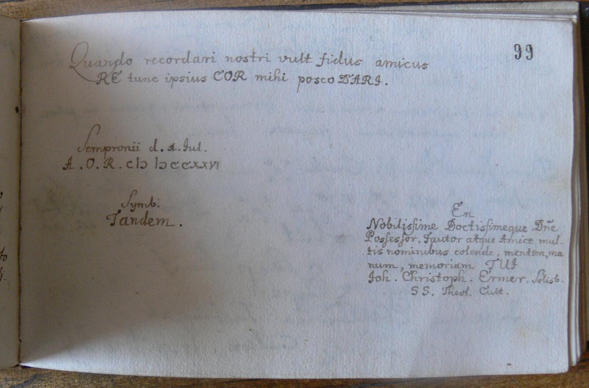 | Kiegészítő szöveg: | En, Nobilissime Doctissimeque D/omi/ne Possessor, Fautor atque Amice multis nominibus colende, mentem, manum, memoriam TUI |