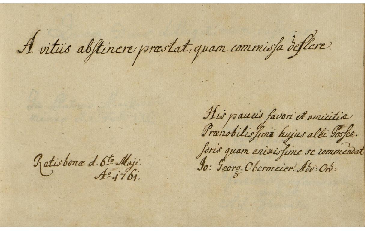 | Kiegészítő szöveg: | His paucis favori et amicitiae Praenobilissimi hujus albi Possessoris quam enixissime se commendat |