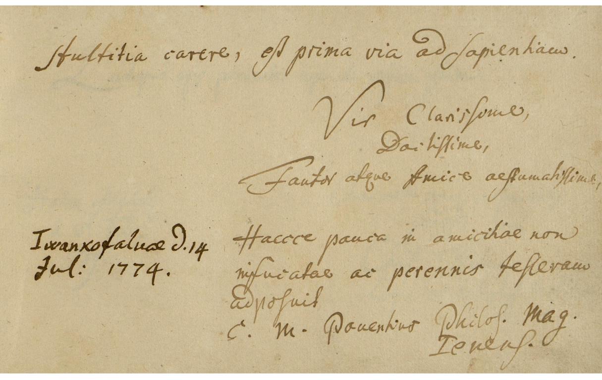 | Kiegészítő szöveg: | Vir Clarissime, Doctissime, Fautor atque Amice aestumatissime, Haecce pauca in amicitiae non infucatae ac perennis tesseram adposuit |