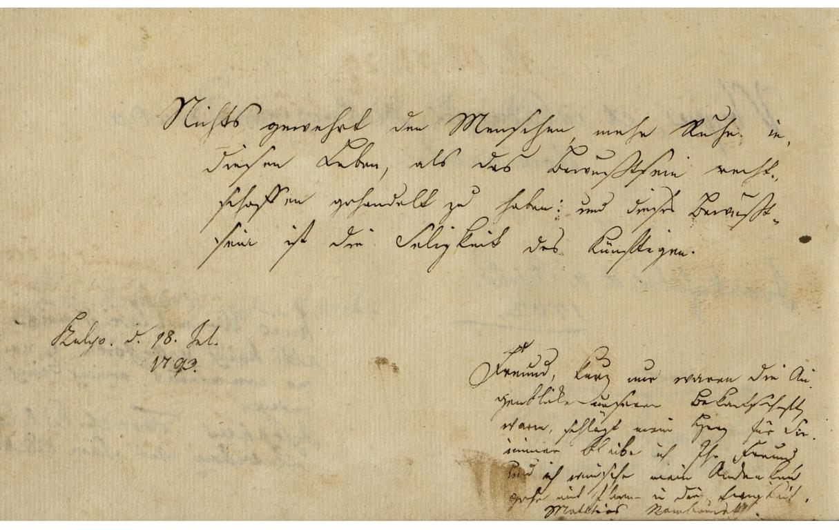 | Az inscriptio szövege: | Nichts gewehrt den Menschen mehr Ruhe in diesen Leben, als das Bewußtsein rechtschaffen gehandelt zu haben: und dieses Bewußtsein ist die Seligkeit des Künftigen. |