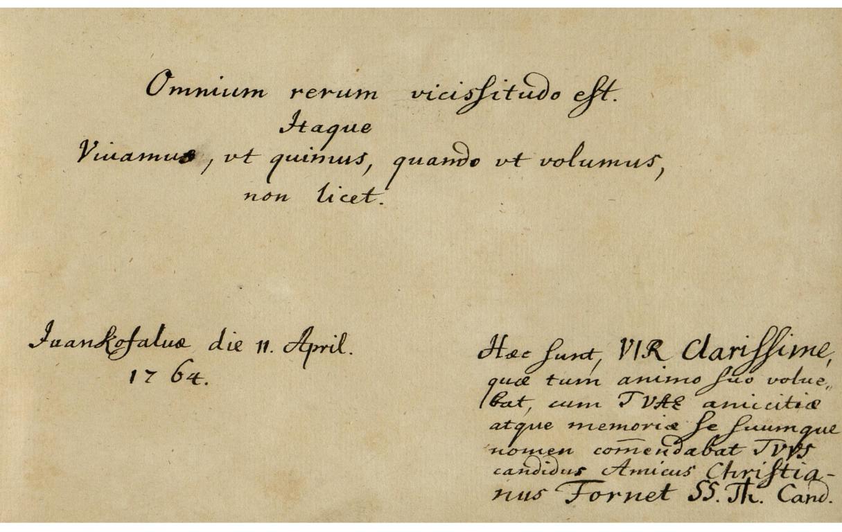 | Kiegészítő szöveg: | Haec sunt, VIR Clarissime, quae tum animo suo voluebat, cum TVAE amicitiae atque memoriae se suumque nomen com/m/endabat TVVS candidus Amicus |