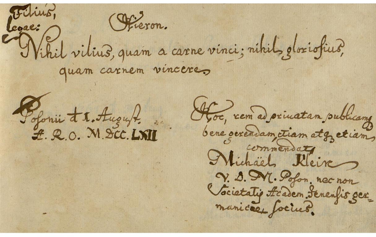 | A bejegyző titulusa: | V/erbi/ D/ei/ M/inister/ Poson/iensis/, nec non Societatis Academ/iae/ Jenensis germanicae socius |
