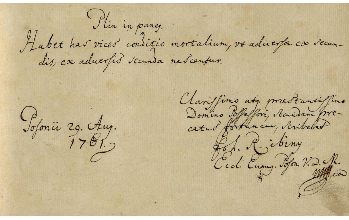 | Kiegészítő szöveg: | Clarissimo atque praestantissimo Domino Possessori secundam precatus fortunam scribebat |