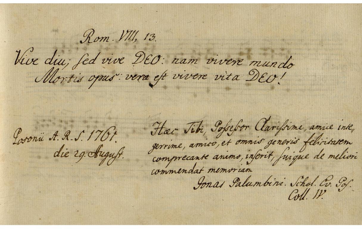 | Kiegészítő szöveg: | Haec Tibi, Possessor Clarissime, amice integerrime, amico et omnis generis felicitatem comprecante animo inserit, suique de meliori commendat memoriam |