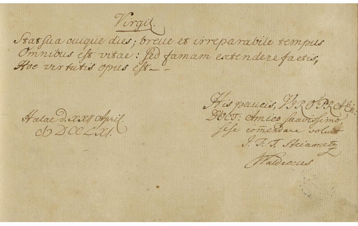 | Az inscriptio szövege: | Stat sua cuique dies, breue et irreparabile tempus |