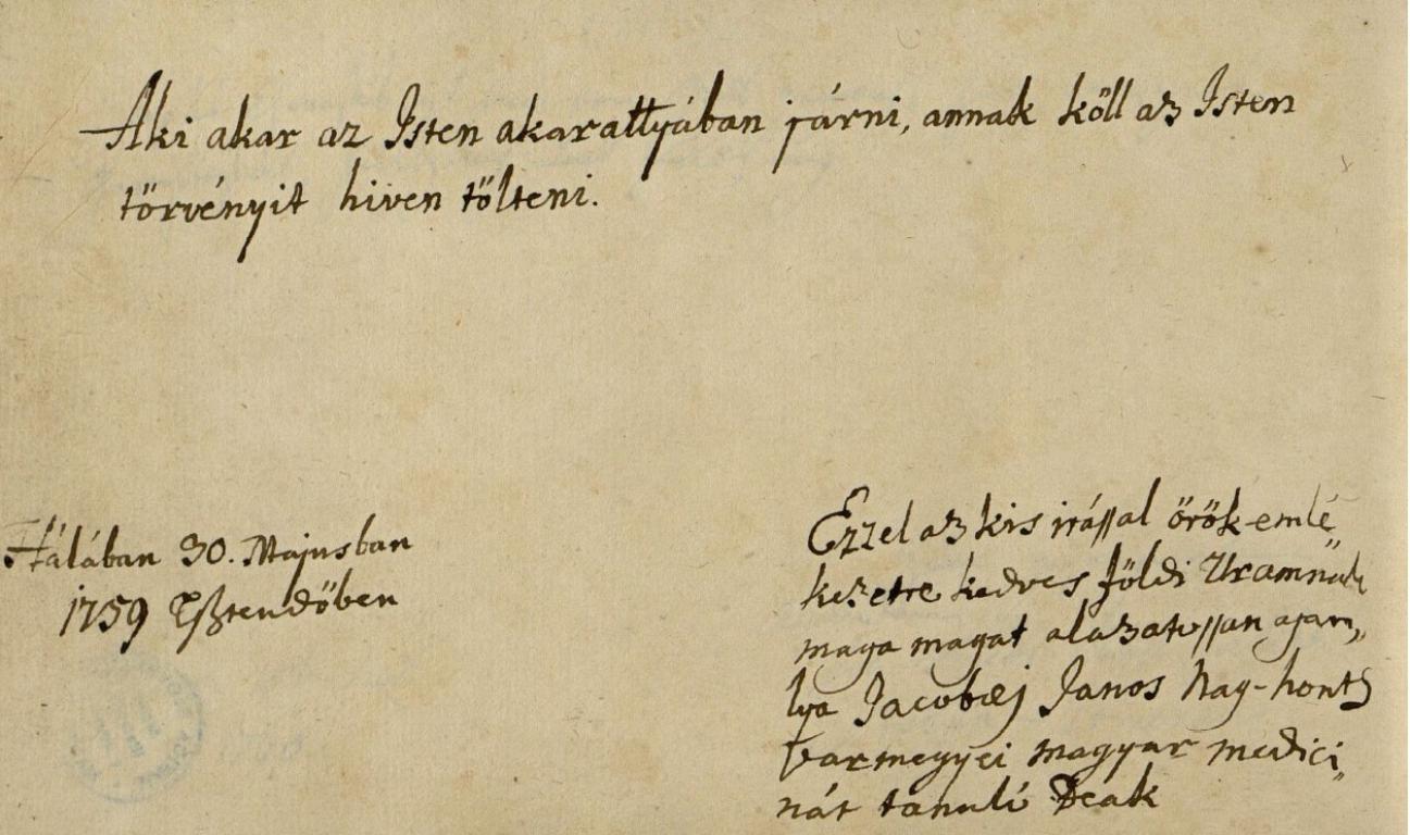 | Kiegészítő szöveg: | Ezzel az kis irással őrők emlékezetre kedves főldi Uramnak maga magat alazatossan ajanlya |