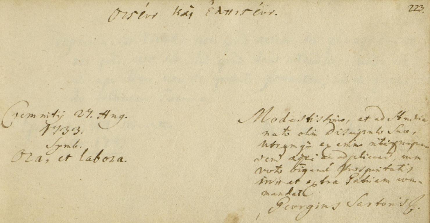 | Kiegészítő szöveg: | Modestissimo et ad studia nato olim Discipulo suo utrumque ex animo rite perpendend/um/, aeque ac adplicand/um/ cum voto o/mn/igenae prosperitatis in et extra Patriam commendat |