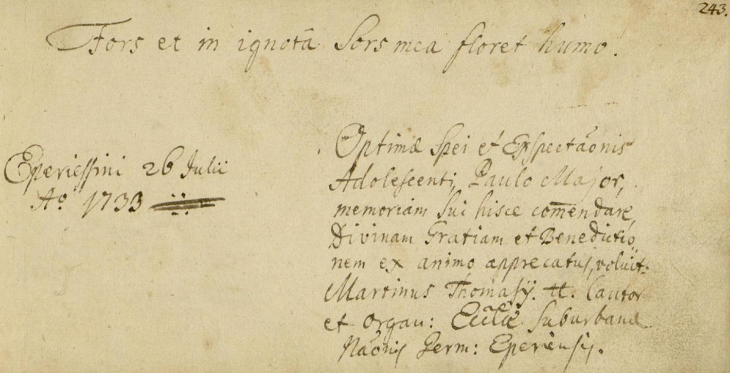 | Kiegészítő szöveg: | Optimae spei et Exspecta/ti/onis Adolescenti, Paulo Major memoriam sui hisce com/m/endare Divinam Gratiam et Benedictionem ex animo apprecatus voluit |