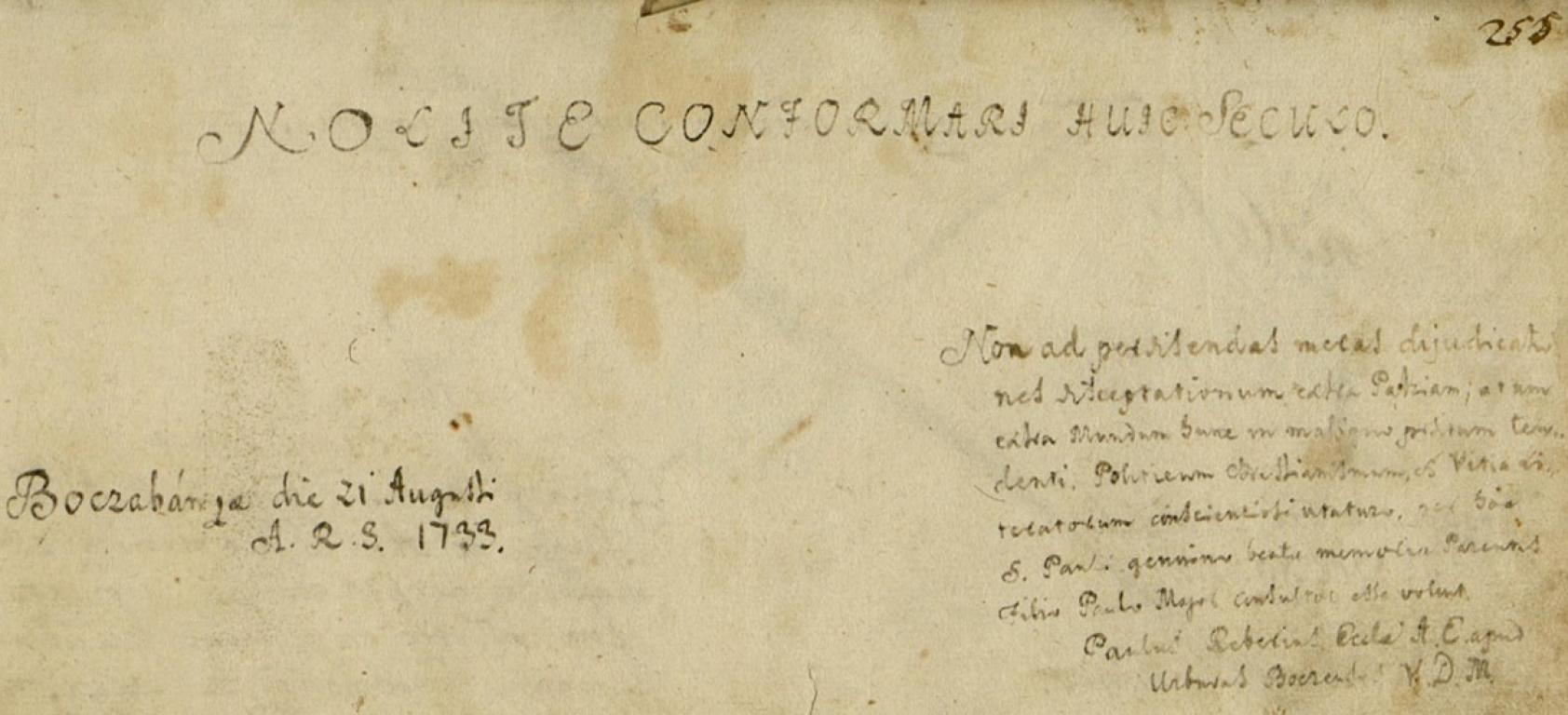 | Kiegészítő szöveg: | Non ad perdis[c]endas meras dijudicationes disceptationum extra Patriam, at non extra Mundum hunc in maligno positum tendenti Politicum Christianismum et vitia Literatorum conscientiose [?] utaturo per hoc S/ancti/ Pauli genuino beatae memoriae Parentis Filio Paulo Major consultus esse voluit |
