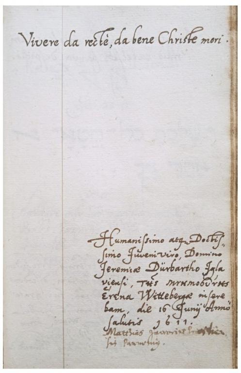 | Kiegészítő szöveg: | Humanissimo atque Doctissimo Juveni viro, Domino Jeremiae Dürbartho Iglaviensi th=j mnhmosu/nhj e3neka ... inserebam |
