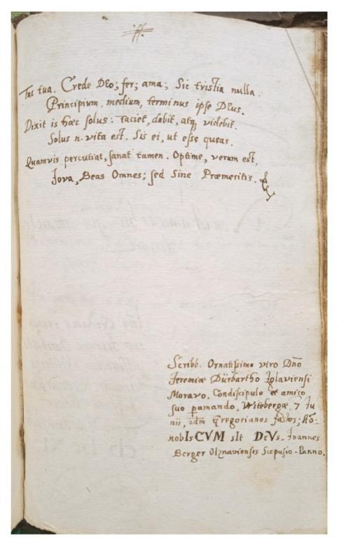 | Kiegészítő szöveg: | Scrib/e/b/at/ Ornatissimo viro, D/omi/no Jeremiae Dürbartho Iglaviensi Moravo, Condiscipulo et amico suo p/er/amando |