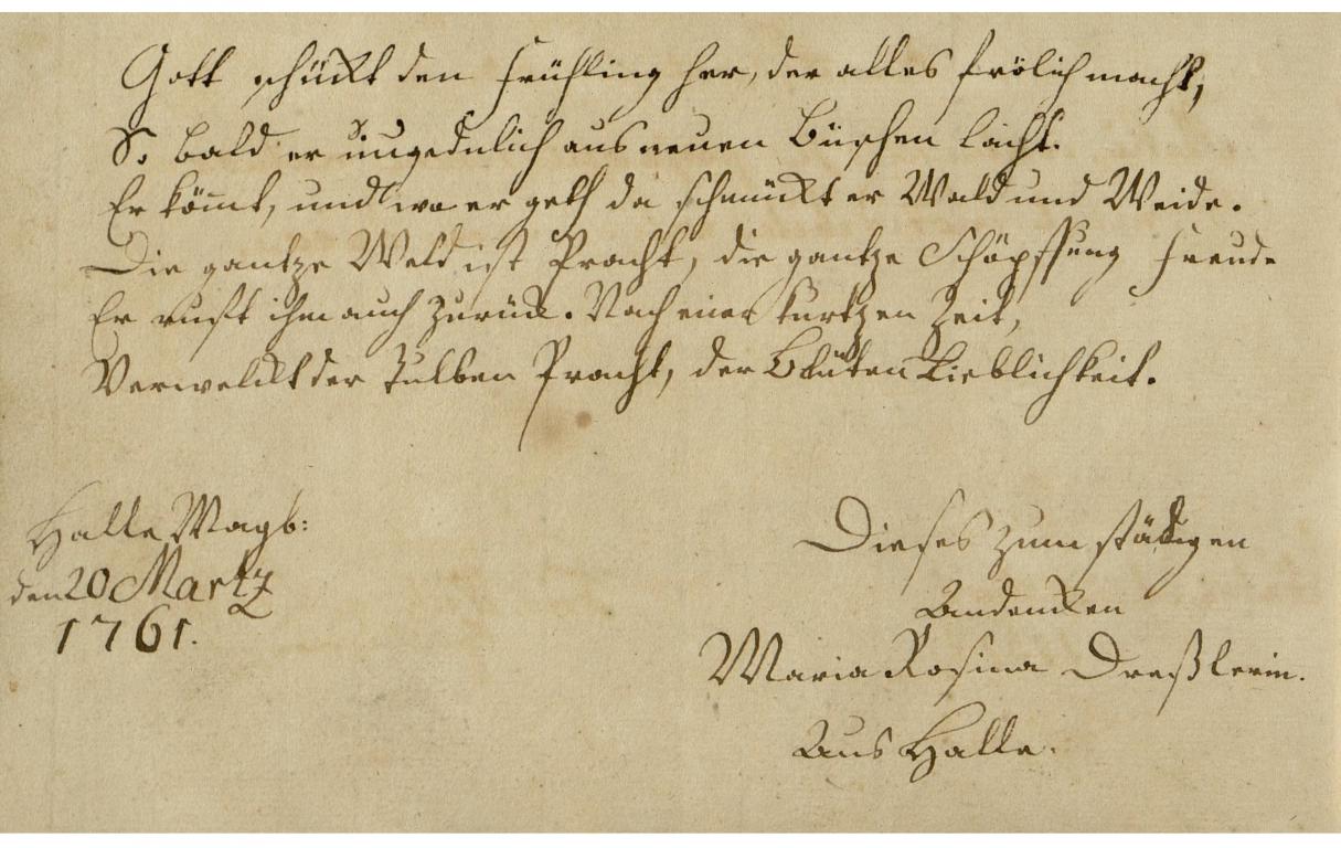 | Az inscriptio szövege: | Gott schükt den frühling her, der alles frölich macht, |