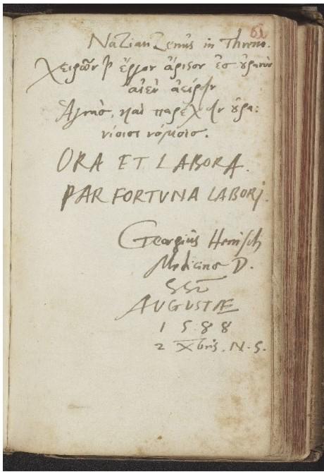 | Az albummal kapcsolatos általános megjegyzések: | Az albumban 1585-1588 között keltezett bejegyzések olvashatók, s megtalálhatók benne Luther és Melanchthon beragasztott autográfjai is. |