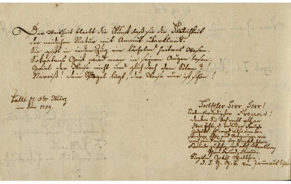| Kiegészítő szöveg: | Hochedler Herr, Herr! liebenswürdigster Freund! Denken Sie doch recht oft an Ihre ächte u/nd/ redlichen Freund zurüke. Es wird also eine besondere Ehre und Vergnügen vor mich sein unter der Vnzal Ihrer Freunde zu stehen, und mich lebenslang Ihren Freund zu nen/n/en |