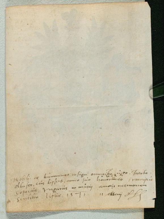 | Kiegészítő szöveg: | Nobilj ac humanitate insigni ornatiss/im/o uiro, Jacobo Olhafen, ciui Lipsensi, amico suo honorando ... in mutuj amoris memoriam scribebat |