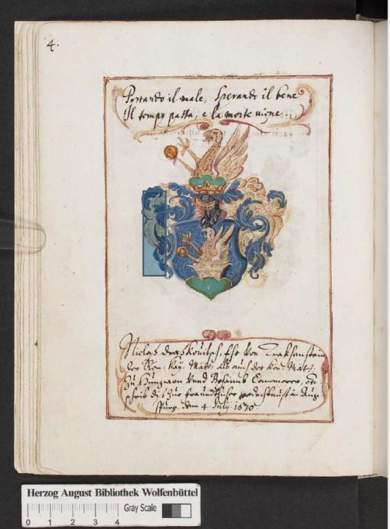 | A bejegyző titulusa: | Fr/ei/h/err/ von Trakhenstein, der Röm/ischen/ Kay/serlichen/ Mä/ies/t/ä/t als auch der Kön/iglichen/ Mä/ies/t/ä/t zu Hungarn Vnnd Boheimb Cammerer etc. |