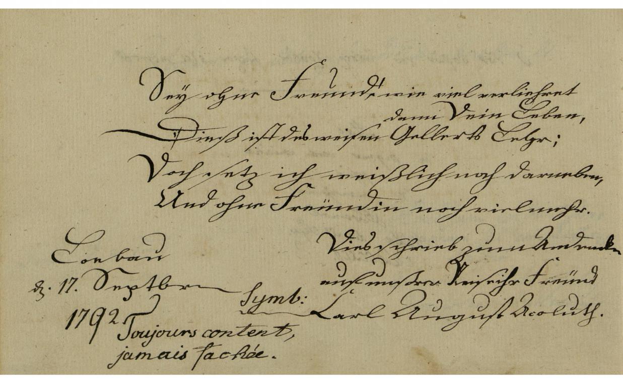 Az inscriptio szövege: | Sey ohne Freund, wie viel verliehret denn Dein Leben, |