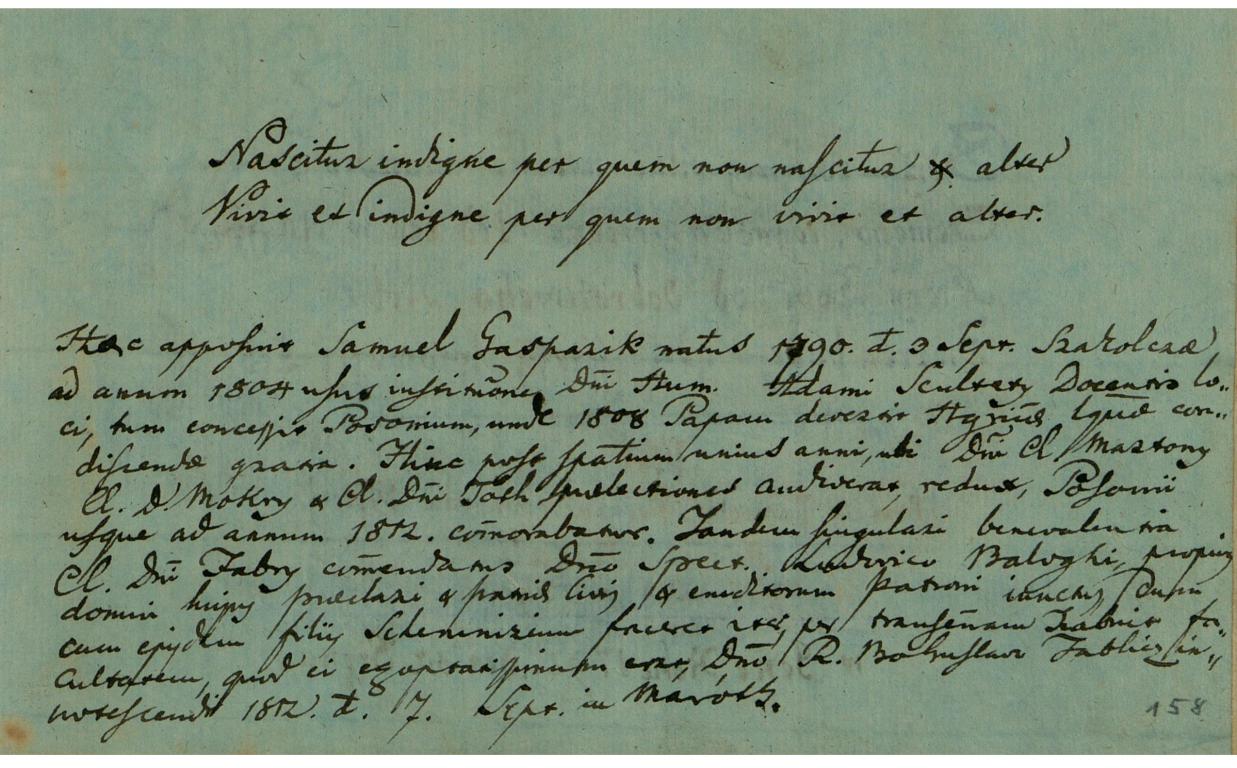 | Kiegészítő szöveg: | Samuel Gasparik natus 1790. d/ie/ 3. Sept/embris/ Szakolczae, ad annum 1804. usus institu/ti/one Dom/ini/ Hum/anissimi/ Adami Scultety, Docentis loci, tum concessit Posonium, unde 1808. Papam devertit H/un/g/a/ricae l/in/guae condiscendae gratia. Hinc post spatium unius anni, ubi D/omi/ni Cl/arissimi/ Martony, Cl/arissimi/ D/omini/ Mokry et Cl/arissimi/ D/omi/ni Toth praelectiones audiverat, redux Posonii usque ad annum 1812. com/m/orabatur. Tandem singulari benevolentia Cl/arissimi/ D/omi/ni Fabry com/m/endatus D/omi/no Spect/abili/ Ludovico Baloghi propius domui hujus praeclari et patriae Civis et eruditorum patroni iunctus, dum cum ejusdem filiis Schemnizium faceret iter, per transen/n/am habuit facultatem, quod ei exoptatissimum erat, D/omi/no R/everendo/ Bohuslavo Tablicz innotescendi 1812. d/ie/ 7. Sept/embris/ in Maróth. |