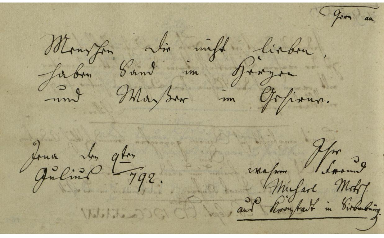 | Az inscriptio szövege: | Menschen, die nicht lieben, haben Sand im Herzen und Wasser im Gehirne. |