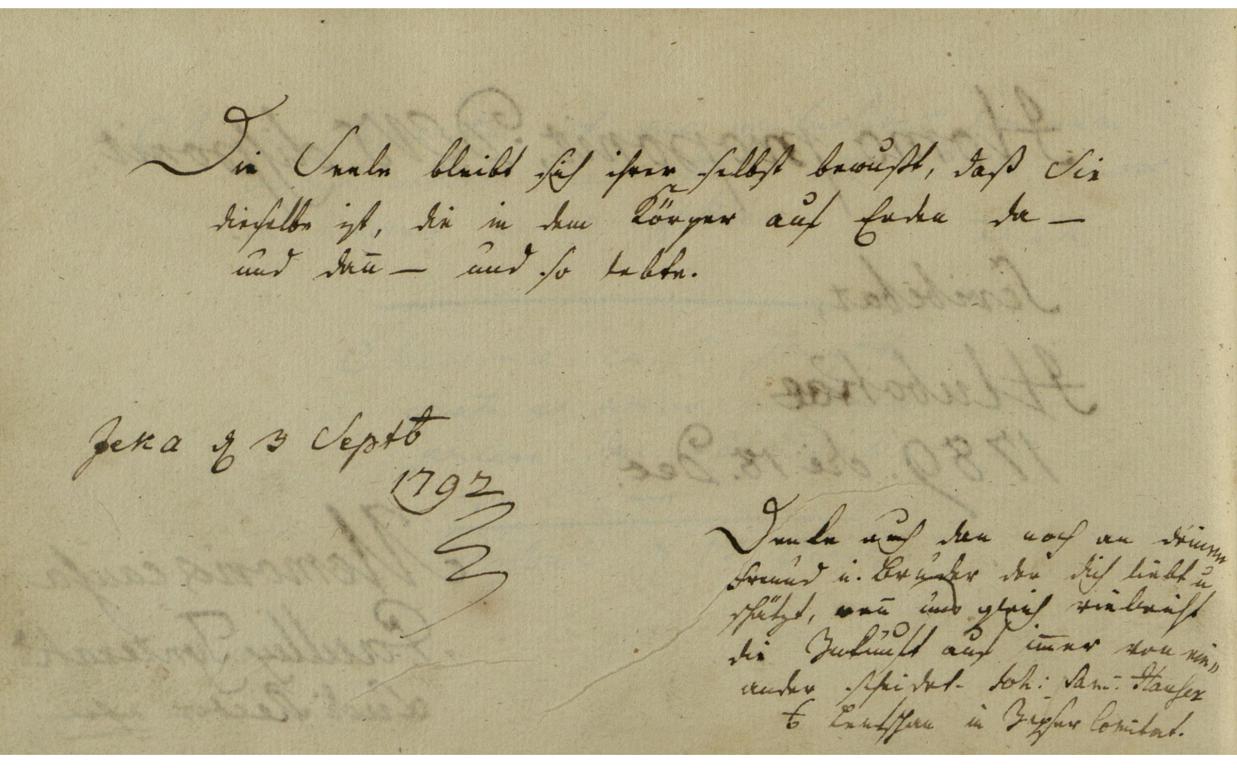 | Az inscriptio szövege: | Die Seele bleibt sich ihrer selbst bewußt, daß sie dieselbe ist, die in dem Körper auf Erden da - und dan/n/ - und so lebte. |