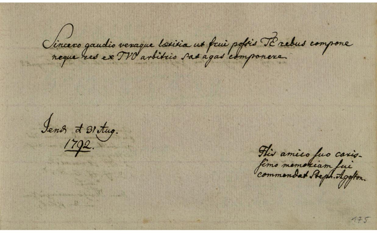 | Az inscriptio szövege: | Sincero gaudio veraque laetita ut frui possis, TE rebus compone, neque res ex TVO arbitrio sat agas componere. |