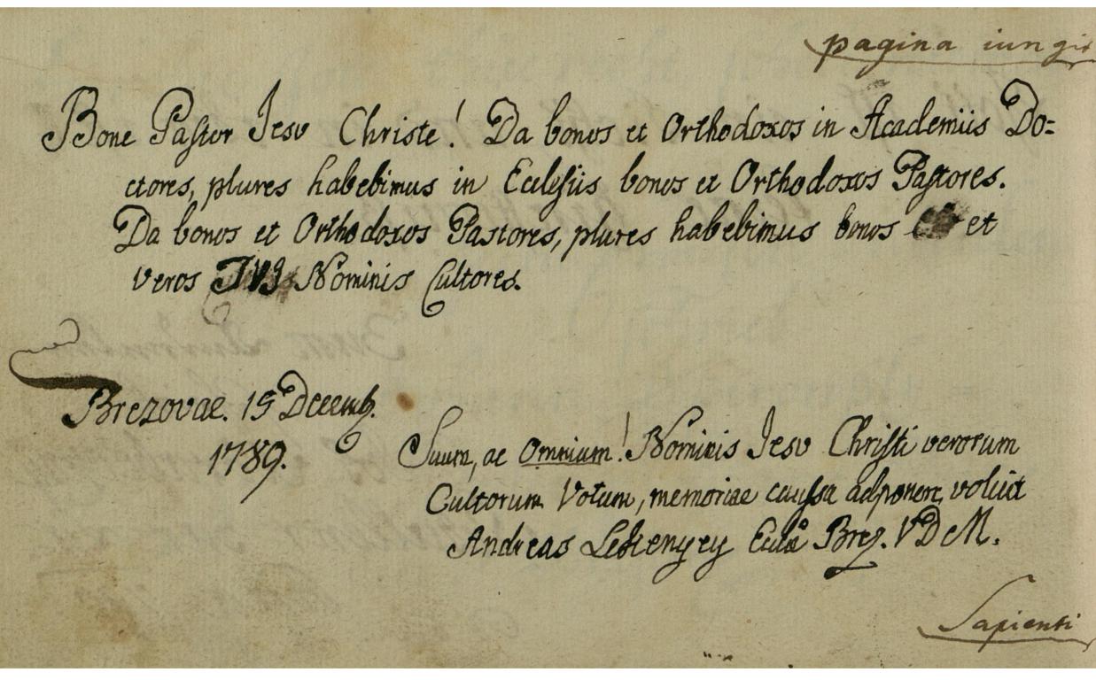 | Az inscriptio szövege: | Bone Pastor Jesv Christe! Da bonos et Orthodoxos in Academiis Doctores, plures habebimus in Ecclesiis bonos Orthodoxos Pastores. Da bonos Orthodoxos Pastores, plures habebimus bonos et veros TVI Nominis Cultores. |