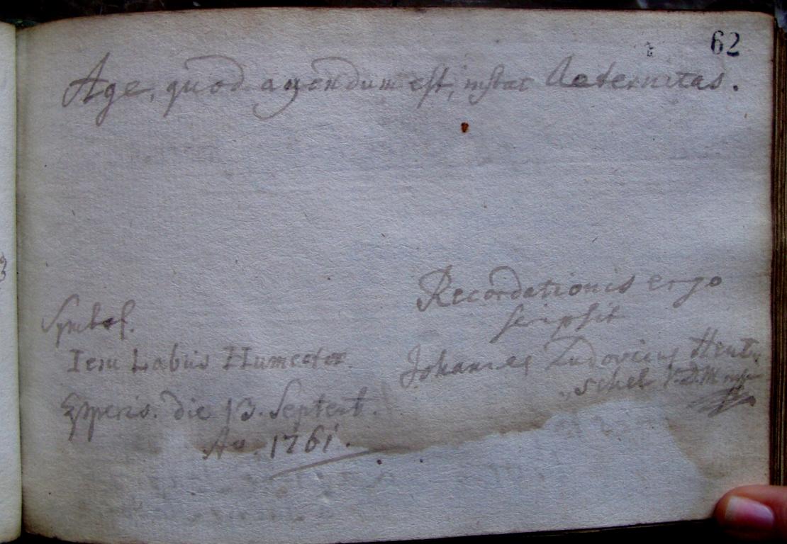 | Az albummal kapcsolatos általános megjegyzések: | Az albumban 1761-1762 között keltezett bejegyzések olvashatók. Az album tulajdonosának két emlékkönyve is ismert. A másikat peregrinációja során használta (Országos Széchényi Könyvtár, Oct. Lat. 117.). |