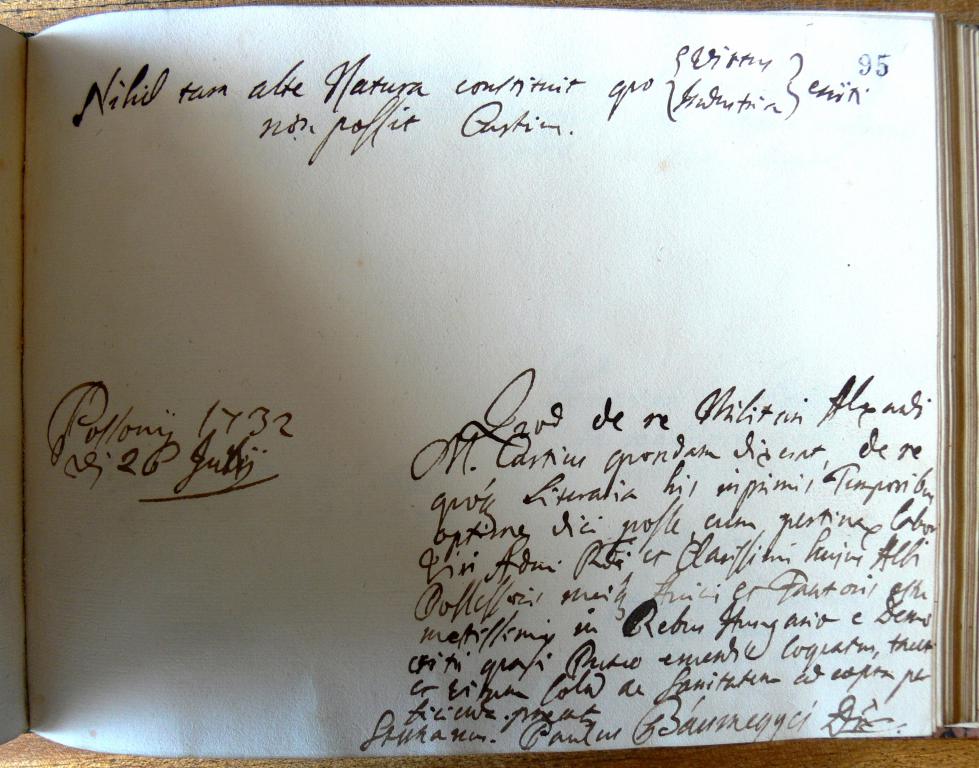 | Kiegészítő szöveg: | Quod de re Militari Alexand[r]i M/agni/ Curtius quondam dixerat, de re quoque Literaria his inprimis Temporibus optime dici posse, cum pertinax labor Viri Adm/odum/ R/everen/di et Clarissimi hujus Albi Possessoris meique Amici et Fautoris aestumatissimi in Rebus Hungariae e Democriti quasi Puteo [...] loquatur, taceret [...], ac sanitatem ad coepta perficienda precat/ur/ |