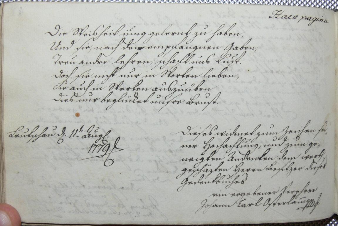| Az inscriptio szövege: | Die Weisheit iung gelernt zu haben, Und sie nach den empfangnen Gaben Treu andre lehren schaft uns Lust. Doch, sie nicht nur in Worten lieben, Sie auch in Werken auszuüben, dies nur beglücket unsre Brust. |