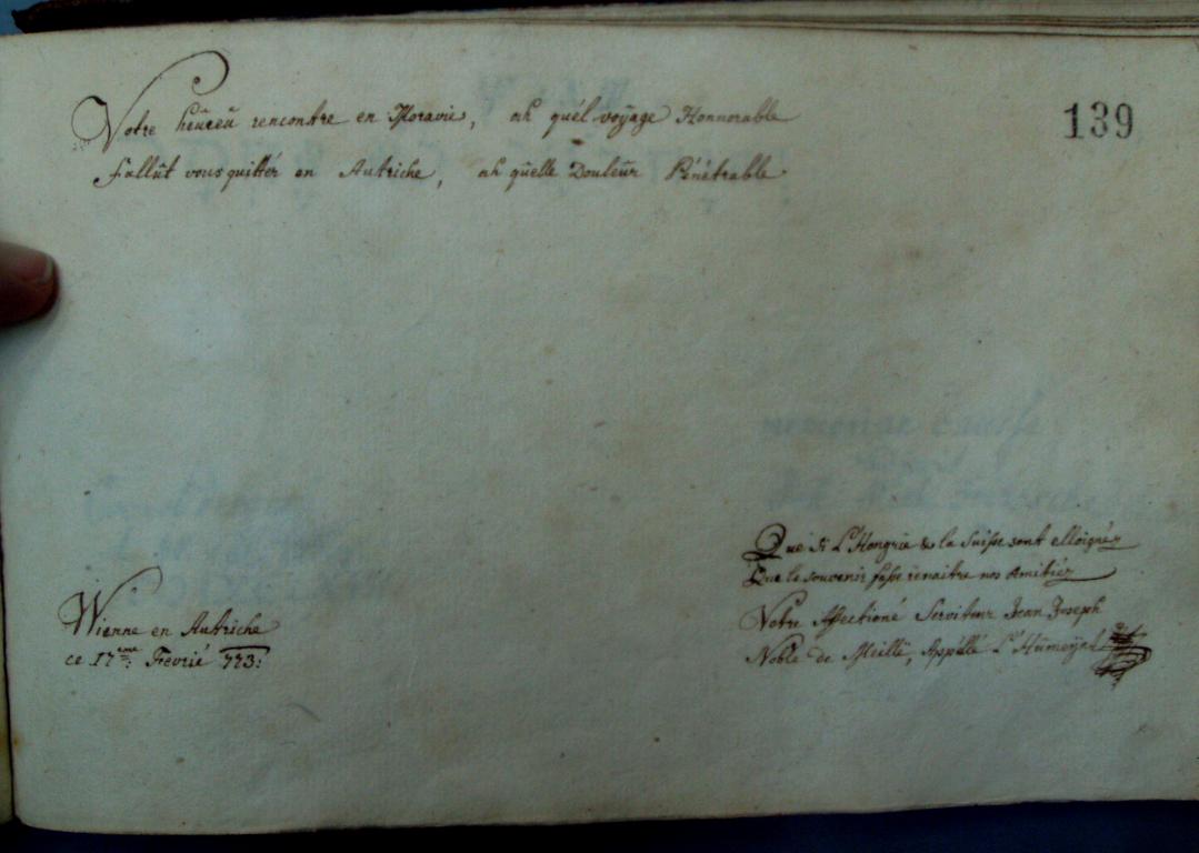 | Kiegészítő szöveg: | Que si L'Hongrie et la Suisse sont alloignez Que le souvenir fosse [?] unaitre [?] nos Amitiéz Votre Affectioné Serviteur |