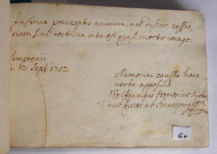 | A bejegyző saját aláírása: | Wolffgangus Honorius Richardus ... ab Auersperg |