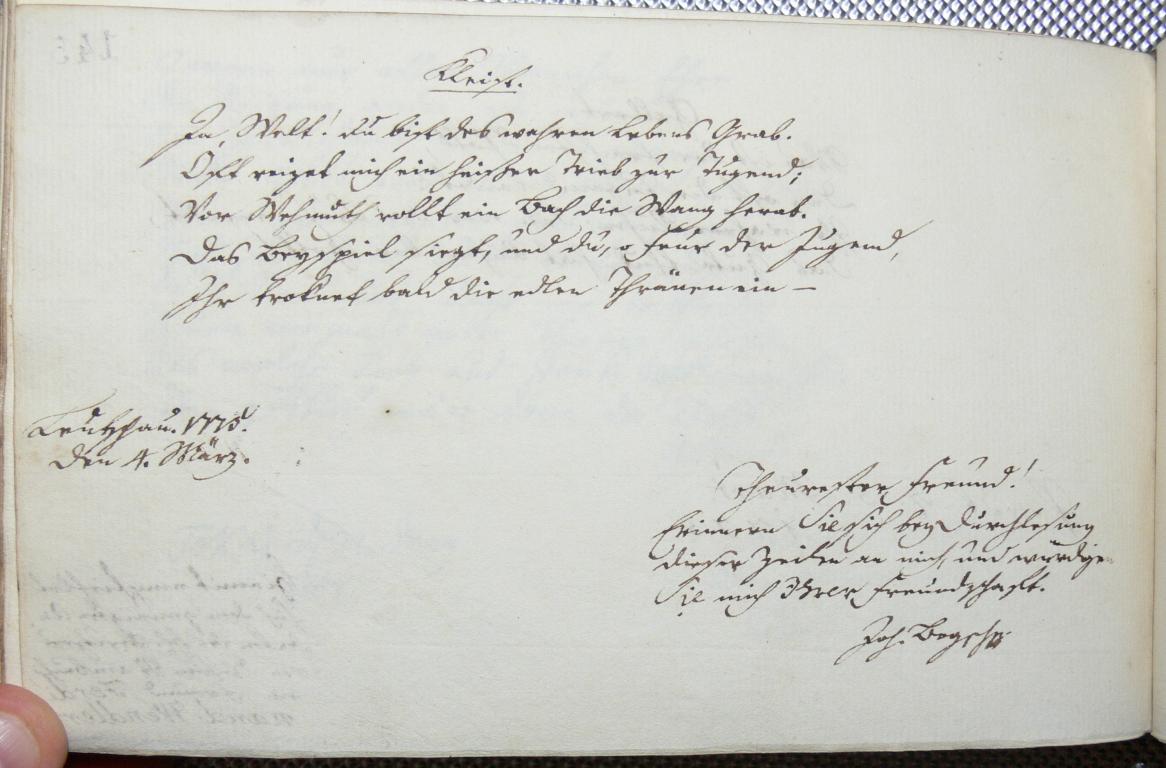 | Kiegészítő szöveg: | Theurester Freund! Erinnern Sie sich bey durchlesung dieser Zeilen an mich, und würdigen Sie mich Ihrer Feundschaft |