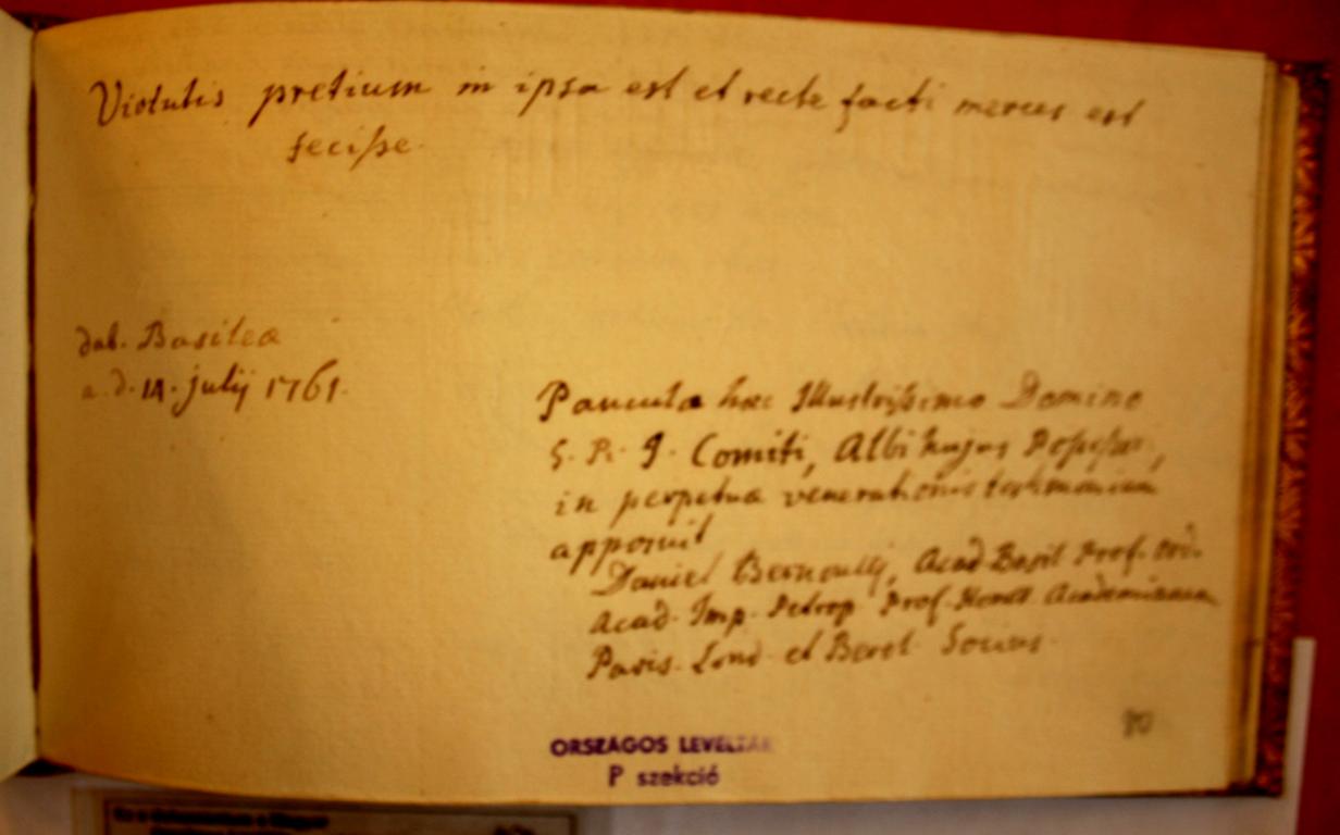 | A bejegyző titulusa: | Acad/emiae/ Basil/iensis/ Prof/essor/ Ord/inarius/, Acad/emiae/ Imp/erialis/ Petrop/olitanae/ Prof/essor/ Honor/atus/, Academiarum Paris/iensis/, Lond/inensis/ et Berol/inensis/ Socius |