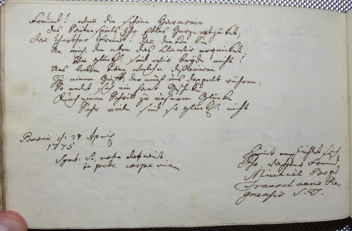 | Az inscriptio szövege: | Freund! wen/n/ die schöne Harmonie des Saitenspiels Ihr Edles Herze entzücket, dan/n/, Werther Freund! dan/n/ denken Sie An mich, den eben das Clawir erquicket. Wie glückl/ich/ sind wir beyde nicht! Uns leiten Töne, welche dissonieren zu einem Geisst, der muss uns doppelt rühren: So endet sich ein hart Geschicke Durch einen Schritt zu unserm Glücke, Sehr viele sind so glückl/ich/ nicht. |