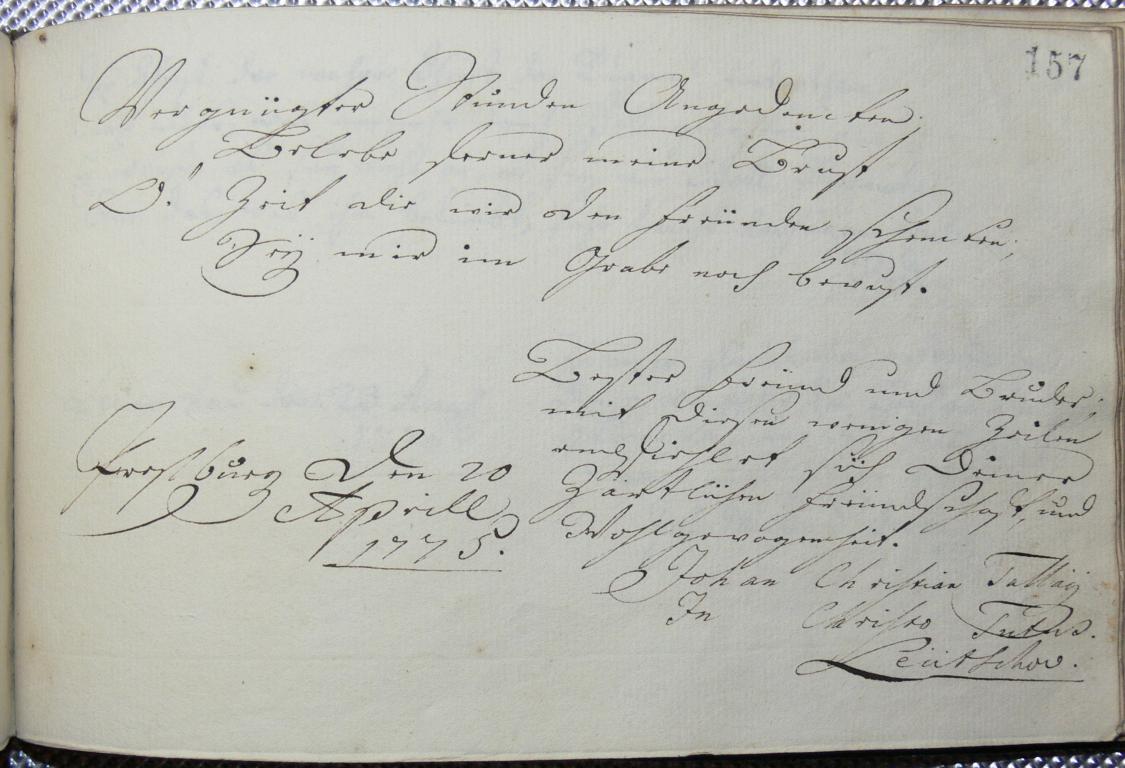 | Az inscriptio szövege: | Vergnügter Stunden Angedencken, Belebe ferner meine Brust. O! Zeit, die wir den Freünden schencken, Sey mir im Grabe noch bewust. |
